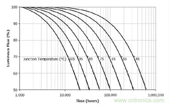 那么泡殼內(nèi)的環(huán)境溫度能夠允許105度嗎?只要看一下下面的一個圖片就知道了。那是美國Cree公司有關(guān)LED芯片結(jié)溫和光衰之間的關(guān)系。
