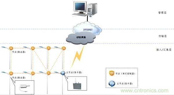 下行:通過zigbee無線方式和控制節點(單燈)通信;上行:通過GPRS等方式與監控中心通信;