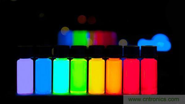 不同大小尺寸的量子點會發出不同的顏色,量子點當受到光或電的刺激時,就發出有色光線,光線的顏色由量子點的組成材料和大小形狀決定,一般顆粒越小,會吸收長波,顆粒越大,會吸收短波。