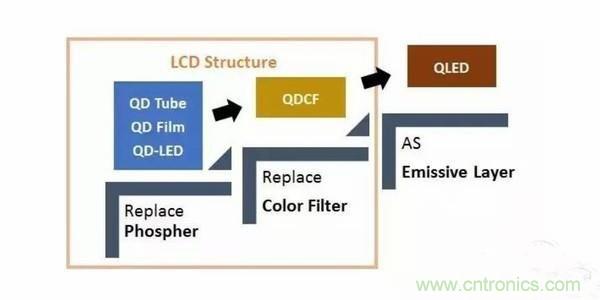 大致可以分為三個階段:一、取代傳統的發光熒光粉;二、去掉彩色濾光片;三正式成為發光層(也就是目前OLED的像素點自發光的形式)