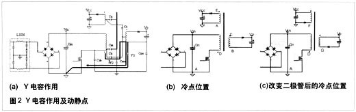 共模電流在輸入及輸出線(xiàn)與大地間流動(dòng),主要有下面幾部分:通過(guò)MOSFET源級(jí)到大地的電容Cde。如果改進(jìn)IC的設(shè)計(jì),如對(duì)于單芯片電源芯片,將MOSFET源極連接到芯片基極,用于散熱,而不是用漏極進(jìn)行散熱,這樣可以減小漏極對(duì)大地的寄生電容。PCB布線(xiàn)時(shí)減小漏極區(qū)銅皮的面積可減小漏極對(duì)大地的寄生電容,但要注意保證芯片的溫度滿(mǎn)足設(shè)計(jì)的要求;通過(guò)Cm 和Cme產(chǎn)生共模電流;通過(guò)Ca和 Cme產(chǎn)生共模電流;通過(guò)Ct和Coe產(chǎn)生共模電流;通過(guò)Cs和Coe產(chǎn)生共模電流,這部分在共模電流中占主導(dǎo)作用。減小漏極電壓的變化幅值及變化率可減小共模電流,如降低反射電壓,加大漏-源極電容,但這樣會(huì)使MOSFET承受大的電流應(yīng)力,其溫度將增加,同時(shí)加大漏-源極電容,產(chǎn)生更強(qiáng)的磁場(chǎng)。如果系統(tǒng)加了Y電容,如圖2所示,通過(guò)Cs的大部分共模電流被Y 電容旁路,返回到初級(jí)的地,因?yàn)閅電容的值大于Coe。Y電容必須直接并用盡量短的直線(xiàn)連接到初級(jí)和次級(jí)的冷點(diǎn)。如果導(dǎo)通時(shí)MOSFET的dV/dt大于關(guān)斷時(shí)的值,Y電容則連接到初級(jí)的地,反之連接到Vin。