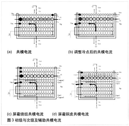 如果在內(nèi)層及初級(jí)、次級(jí)繞組間放置銅皮,銅皮的寬度小于或等于初級(jí)繞組的寬度,銅皮的中點(diǎn)由導(dǎo)線(xiàn)連到冷點(diǎn),如圖3(c)所示,由于銅皮為冷點(diǎn),與其接觸的繞組和銅皮間電壓的擺率降低,從而減小共模電流,同時(shí)將共模電流由銅皮旁路引入到冷點(diǎn)。注意銅皮的搭接處不能短路,用絕緣膠帶隔開(kāi),內(nèi)外層銅皮的方向要一致。輔助繞組和次級(jí)繞組的共模電流可以由以下方法補(bǔ)償:① 加輔助屏蔽繞組:輔助屏蔽繞組繞制方向與次級(jí)繞組保持一致,輔助屏蔽繞組與次級(jí)繞組的同名端連接到一起,并連接到冷點(diǎn),輔助屏蔽繞組的另一端浮空。由于它們的電壓變化的方向相同,所以?xún)烧唛g沒(méi)有電流流動(dòng)。②加外層的輔助屏蔽銅皮:輔助屏蔽銅皮的中點(diǎn)連接到輔助繞組的中點(diǎn)。同樣,基于電壓的變化方向分析電流的方向,可以看到,兩者之間的電流形成環(huán)流,相互補(bǔ)償?shù)窒瑥亩档凸材k娏鳌?br />