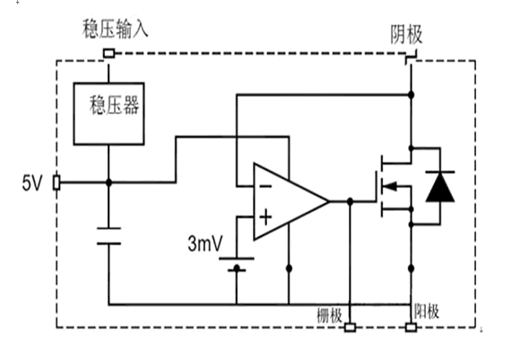 實現與兩端整流器功能相當的器件,必須包括一個MOSFET,一個控制該器件以及內部偏置電源的非??焖偾曳浅C舾械碾娐?。這樣的電路如圖1所示。