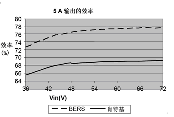 用非連續模式反激轉換器對這一器件進行測試。它設計工作在36到72 Vdc的標準電信輸入范圍內。根據此器件的初始測試,測量到效率明顯地提高。以肖特基二極管(MBRB4030),然后以BERS(NIS6111)同步整流器進行效率測試。功率FET的溫度也明顯降低,因為電路中同步整流器產生的功率也下降了。圖2所示 5安培負載條件下,FET溫度下降了20℃到40℃。從而能節約散熱器并提高可靠性。