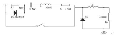 在開關控制電源的輸入部分加入緩沖電路(見圖3),其由線性阻抗穩定網絡組成,用于消除電力線干擾、電快速瞬變、電涌、電壓高低變化和電力線諧波等潛在的干擾。緩沖電路器件參數為D1為MUR460,R1=500Ω,C=6nF,L=36mH,R=150Ω。