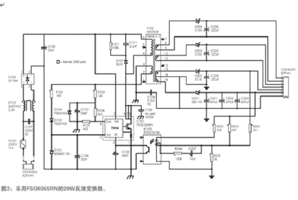 圖2說明了Fairchild全球電源資源中心德國的設計的示例應用,R103-5、D104和C103為檢測最小漏極電壓所需的額外元件,FOD2741為誤差放大器,它在同一封裝中結合了標準光耦合器和工業標準的431參考,其它元件為反激變換器的標準部分。