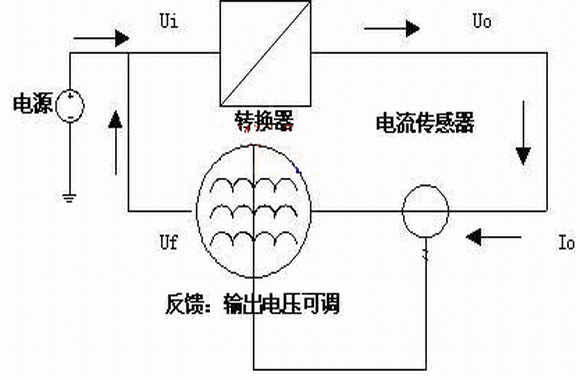 能量反饋部分和需要例行試用的轉(zhuǎn)換器組成一個(gè)能量循環(huán)系統(tǒng),在外電源的激勵(lì)下,系統(tǒng)保持額定功率運(yùn)轉(zhuǎn)。由功率公式P=U*I,U由例行老化的電源轉(zhuǎn)換器穩(wěn)定,要保證該額定功率,就是保證輸出電流I,即能量反饋部分設(shè)計(jì)成恒流電路,所以系統(tǒng)在額定功率下,保證能量循環(huán)穩(wěn)定工作的等效控制量為需要例行使用的電能轉(zhuǎn)換器的輸出電流。