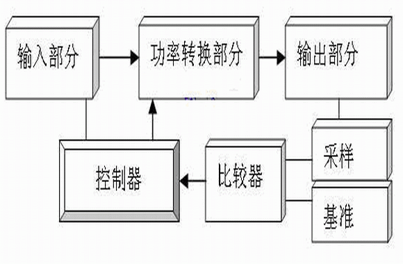 從以上能量反饋系統(tǒng)工作分析可知,能量反饋部分為系統(tǒng)穩(wěn)定工作提供必要的保證, 能量反饋部分組成可由圖5所示,主要包括:輸入部分、功率轉(zhuǎn)換部分、輸出部分、采樣、基準(zhǔn)、比較器和控制器七個(gè)組成部分。