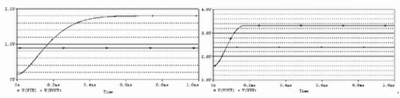 此DC/DC轉換器在低電壓0.9V下就可以正常工作;典型的輸入/輸出值為:VIN=2.4V,VOUT=3.3V,模擬結果如圖5、圖6所示。