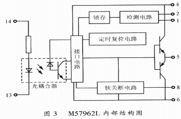 M57962AL是一種14腳單列直捕式結構的厚膜驅動模塊,其內部結構圖如圖3所示。它由光耦合器、接口電路、檢測電路、定時復位電路以及門關斷電路組成,驅動功率大,町以驅動600A/600V及400A/l200V等系列IGBT模塊。