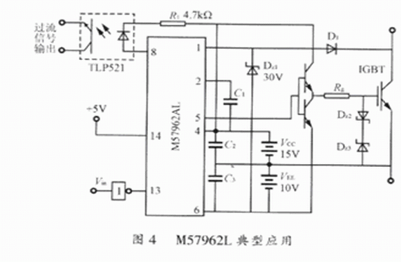 M5796AL具有高速的輸入輸出隔離,絕緣電壓也可達到AC 2500V/min;輸入電平與TTL電平兼容,適于單片機控制;內部有定時邏輯短路保護電路,同時具有延時保護特性;采用雙電源供電方式,相對于EXB84l來說,雖然多使用一個電源.但IGBT可以更可靠地通斷。