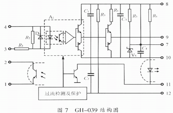 其內部結構圖如圖7所示,工作原理與EXB和M57系列模塊相類似,這里不再贅述。而與EXB系列和M57系列的模塊不同的是該模塊已含有保護后發送報警或動作信號的光耦合器,所以使用中不需要像EXB和M57系列的模塊外接光耦合器,因而更加方便,其性能比EXB和M57系列的模塊在保護性能上更加優越;在可靠性方面,由于GH-039是單電源供電,不能提供負偏壓,從而導致ICBT不能可靠地關斷。與HL402相比,CH-039保護功能還不完善,它也同EXB841和M57962AL一樣無降柵壓保護。因此,GH-039驅動模塊也是有缺陷的。