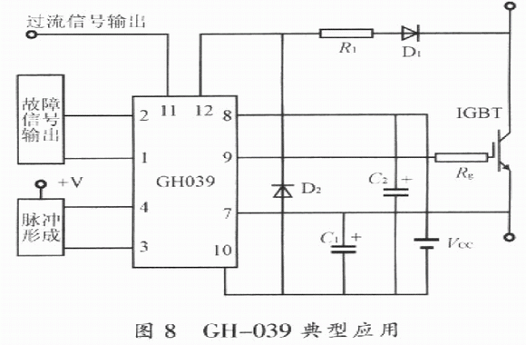 GH-039典型接線圖如圖8所示。工作電源VCC為26V;為了保持電壓穩定,濾波電容器應盡可能靠近GH一039模塊安裝和使用,且其電容值不能小于10μF,并應選用高質量的電容;串入GH-039腳12與ICBT集電極之間的二極管D1,應選超快速恢復二極管,并且要保證其反向耐壓不低于ICBT的集電極與柵極之間的額定電壓;為防止所連接的過流保護端子光電隔離器的誤動作,應在D1與GH一039的腳12之間串入100Ω的電阻;接于腳lO與腳12之間的D2選用超快速恢復二極管,其反向耐壓可以低于IGBT的集射極間耐壓。