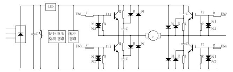 電機停車或減速時工作在制動狀態(tài),儲存在電機和負載運動部分的動能將變成電能,并通過PWM 變換器回饋給直流電源。系統(tǒng)有不可控的整流器供電,不能向電網(wǎng)回饋電能,只好對電容器C 充電而使泵升電壓升高,過高的泵升電壓有可能擊穿變換元件。泵升電壓檢測電路如圖3。