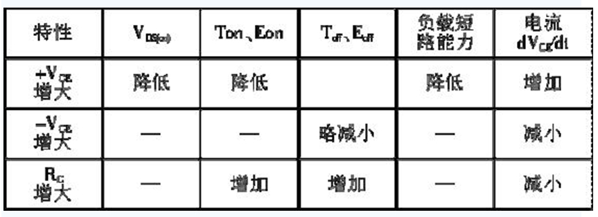 IGBT 的驅動條件與它的靜態和動態特性密切相關。柵極的正偏壓+VGE、負偏壓-VGE 和柵極電阻RG 的大小,對IGBT 的通態電壓、開關時間、開關損耗、承受短路能力以及dVCE/dt等參數都有不同程度的影響。門極驅動條件與器件特性的關系如表1 所示。
