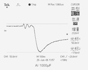 1、當測試電容為(AL)液體鋁電解電容器CT=1000μF ESR=56mΩ時,輸出電壓下跌值為232mV。