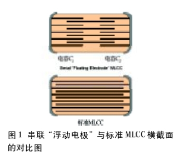 許多年前,人們發現在空氣中測試500VDC以上的電壓時,MLCC標準設計的性能出現了問題。有效層(active layer)之間的內部擊穿和接線端之間的表面弧導致了故障的出現。為了解決電容器的有效區(active area)的電壓應力問題,制造商開發出了一種串聯“浮動電極”設計,在單個元件內有效集成了2個以上的電容器組。圖1是這類設計與標準MLCC的比較。