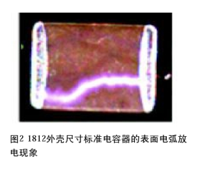這些電容器的電容值通常是相同的,所以在這種情況下每個電容器的有效電壓(VC)都等于施加在該器件上的總電壓(VT)除以電容器的數目(n)即VC=VT/n。利用這種方法可以降低每個電容器組的有效電壓。高壓電路的設計者還利用這個原理,通過串聯單個電容器來降低每個電容器的電壓。不過,在兩種情況下總電容(CT)都將會下降:1/CT=(1/C1+1/C2…+1/Cn)利用一臺高速相機觀察到了另一個重要的問題,即在一個標準電容器設計上施加一個電壓之后出現的表面電弧放電現象,如圖2所示。“浮動電極”串聯設計可以有效地解決表面弧的問題。不過,與如前所述的標準設計相比,其主要弊端在于其較低的容量。