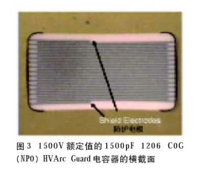 表面電弧放電問題可以通過涂層電容器得到進一步的解決。增加引線和涂覆環氧樹脂是一種有效的解決方案,但如此一來這種產品不再是可以表面貼裝的。近來已出現一些涂層已用來保持表面貼裝的能力,但是這些解決方案過于昂貴,而且制造工藝非常復雜。組裝電路板類似涂層的應用還可以防止電弧放電的發生,但是除了額外成本外,在許多情況下涂層會不利于最終用戶最后組裝期間的進一步焊接。為了克服這些缺點,人們開發出了HVArc Guard電容器,它采用了專利的內部電極配置,可以防止表面電弧放電現象。盡管這種配置不會像串聯設計那樣能夠降低內部有效電壓,但在許多情況下有效重疊區(active overlap area)會增加超過300%,有助于實現較高的容量和使電容器進一步小型化。HVArc Guard MLCC的橫截面如圖3所示。