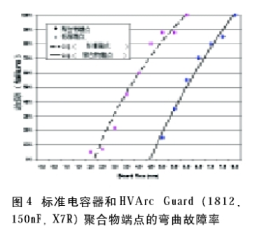 如同在前一部分中提到的那樣,焊接引線和涂層已廣泛用于生產高壓元件。除了引線外,引線框也可以用來封裝多個電容器,以得到更高的容量和增加符合性。盡管增加一個鷗翼型引線框會顯著增加元件的成本,但是它可以避免電路板彎曲的發生。直到最近,都沒有有效的方法來增加表面貼裝器件端點的符合性,但這個歷史已經一去不復返了。通過在環氧聚合物端點上加上銀,可以防止電路板彎曲時發生的故障,進而增加可靠性。這種選擇目前已用于我們的OMD-Cap范圍高壓系列設計以及HVArc Guard電容器。當電路板彎曲時,標準電容器與相同HVArc Guard電容器的聚合物端點的測試顯示的故障率差異如圖4所示。