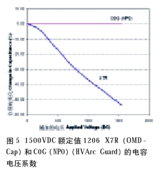 高壓電容器通常是采用X 7 R 和C0G 電解質制造的。這些名稱描述了在-55~+125℃溫度系數將分別為美國電子工業協會(EIA)的±15%和±30×10-6/℃。C0G電容器也可以用更常用的術語表示,即NP0(正負零)。不過,值得注意的是,在1kHz條件下以1Vrms進行電容測量非常重要,各種材料可以用這些名稱來描述。對許多電源應用來說,重要的是知道在某個具體電壓下的電容容量。X7R和C0G(NP0)電容器之間存在顯著的差異;施加了DC電壓的X7R電容器將釋放出大量容量,而C0G(NP0)電容仍然沒有太大的變化。出現這種現象是由于與C0G(NP0)電解質的鐵電性質相比,鐵電X 7 R 材料在剩余極化(remnant polarization)方面有根本的不同。實際上,雖然X7R MLCC具有高得多的容量,但是其容量在施加DC電壓時會顯著下降。這方面的一個例子如圖5所示。因此,當采用多層電容器時,設計人員必須考慮到施加電壓下的可用容量。