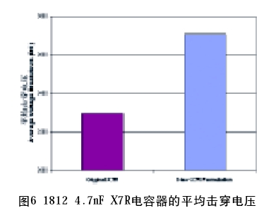 如前面敘述的那樣,有許多材料可以滿足X7R或C0G(NP0)的這類TCC要求。這些材料與各種設計的組合并不能在施加的DC電壓下以完全相同的方式實現。不同制造商任何給定電壓的可用容量一定會有很大的差異。較高的電壓可以與X 7 R 電解質中的鐵電疇(ferroelectric domain)相耦合,在元件上產生一種機械應力。這種“壓電應力”會導致電容器在z方向上若干微米的移動。當然,這是根據壓電執行器的原理,但是在MLCC的情況下,連續的電壓尖峰會導致應力裂紋和故障。為了解決這個問題,應該使用這種具有降低壓電耦合能力的2000VDC 以上額定值的X7R電解質電容器。降低耦合系數的影響可以增加擊穿耐壓,如圖6所示。這些設計采用了完全相同的有效厚度和“浮動電極”型設計。唯一的差異在于X7R電解質的新制劑方面的修改,它可以減少與施加電壓的耦合。這種新制劑已用于我們的高壓OMD-Cap產品線。