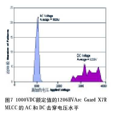 在許多應用中,AC電源處理以及承受AC電壓的能力至關重要。測量這種能力的一種典型方法是在各種高頻條件下施加AC紋波電壓,直到電容器增加到超過環境溫度20℃以上。不過,在X7R電容器與C0G(NP0)的電容器之間又一次出現了顯著的差異,前者的剩余電偶(remnant dipole)隨著施加的電場移動而引起發熱,而后者在這種情況下的溫度不會增加。另一個AC 能力指標是通過施加60Hz AC電壓,將其提升至6kV峰值30s 以上,直到發生電解質擊穿而實現的。這種類型測試的結果可以與對1000VDC額定值的1206 X7R HVArc Guard電容器施加500Vdc/s的破壞測試的DC擊穿電壓相比,如圖7所示。D C 電壓故障的發生遠遠超過了1000VDC額定值。由于AC電壓故障發生在1000VAC左右,與DC電壓相比,故障的分布范圍很窄。