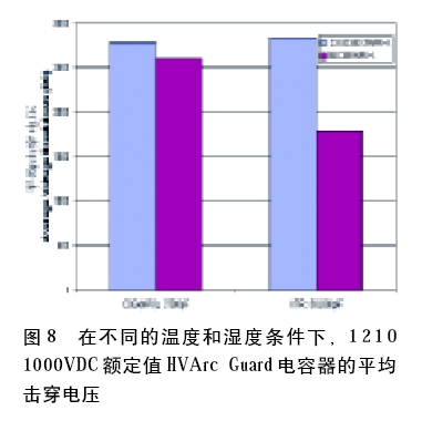 如前面提到的那樣,電容器或電路板涂層可以防止表面弧,而且還可以作為一種防潮的屏障。為了測試HVArc Guard元件對由濕度引起的故障的易感性,對1210外殼尺寸、1000VDC額定值的MLCC樣品進行了擊穿電壓測試,其環境條件為23.8℃/53.3%RH,提高的溫濕度為85℃/85%RH。其結果如圖8所示。盡管在85/85條件下X7R的平均擊穿電壓相當低,但C0G(NP0)幾乎不受影響。因此,C0G(NP0)看似不那么易受潮濕所引起故障的影響,而兩種情況的擊穿都是在容許范圍以內,即使是在高濕度條件下。兩種環境條件下測試的元件擊穿范圍均高于額定電壓。