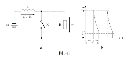 圖1-11-a是并聯(lián)式開關(guān)電源的最簡單工作原理圖,圖1-11-b是并聯(lián)式開關(guān)電源輸出電壓的波形。圖1-11-a中Ui是開關(guān)電源的工作電壓,L是儲能電感,K是控制開關(guān),R是負(fù)載。圖1-11-b中Ui是開關(guān)電源的輸入電壓,Uo是開關(guān)電源輸出的電壓,Up是開關(guān)電源輸出的峰值電壓,Ua是開關(guān)電源輸出的平均電壓。