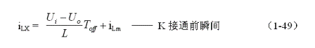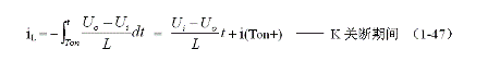 式中i(Ton+)為控制開關(guān)K從Ton轉(zhuǎn)換到Toff的瞬間之前流過電感的電流,i(Ton+)也可以寫為i(Toff-),即:控制開關(guān)K關(guān)斷或接通瞬間,之前和之后流過電感L的電流相等。實際上(1-47)式中的i(Ton+)就是(1-45)式中的iLm,因此,(1-9)式可以改寫為: