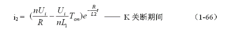 式中C為常數,把初始條件代入上式,就很容易求出C,由于控制開關K由接通狀態(tài)突然轉為關斷時,變壓器初級線圈回路中的電流突然為0,而變壓器鐵心中的磁通量 不能突變,因此,變壓器次級線圈回路中的電流i2一定正好等于控制開關K接通期間的電流i2(Ton+),與變壓器初級線圈回路中勵磁電流被折算到變壓器次級線圈回路電流之和。所以(1-65)式可以寫為: