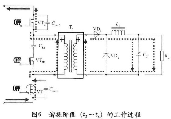 4)諧振階段(t2~t4),如圖6所示,t3時刻鉗位開關管VTR1在ZVS狀態下關斷(VTR1的寄生電容使電壓不能突變),由于變壓器初級電流仍然反向流動,磁芯極性反轉,使第一主開關管VT1和第二主開關管VT2的寄生電容COSS放電,在t3后VD1導通,VD2截止;然后其主開關管的體二極管導通把能量全部送回輸入電源與負載,變壓器磁芯完成磁復位。此時主開關管VT1和VT2的UDS電壓為零,t4時刻同時開啟第一主開關管VT1和第二主開關管VT2做到ZVS導通。在t4完成后,開關周期又返回到t0~t1的狀態。