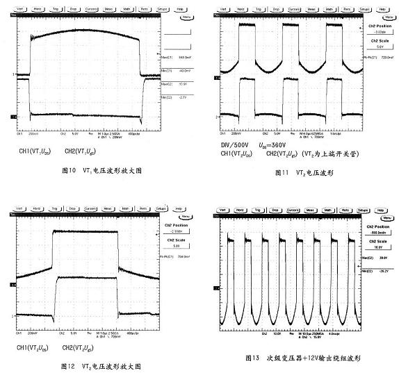 實際波形結果我們實際用一般雙晶體管正激的產品經過改進,將其調整為上述的有源鉗位方式,其實際的雙晶體管工作波形如圖9~圖12所示。