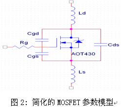 MOSFET寄生參數模型如圖2所示。由于MOSFET的結構、引線和封裝的影響,在MOSFET制作完成后,其各引腳間存在PN結寄生電容和寄生電感,引腳上存在引線電感。由于源極的引線較長,Ls一般要比Ld大。