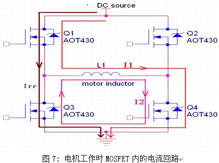 延長MOSFET的開通時間可以減小開通時的涌入電流。由于電機負載為感性負載,所以在PWM關斷時存在續流現象(見圖7中的I2),為了減小續流側反向恢復電流(Irr)的大小,PWM側開關管的開通速度不宜過快。由于MOSFET處于飽和區時有公式:Id=K*(Vgs-Vth)2,(K為一常數,由MOSFET的特性決定)。所以在一定的溫度和Vds條件下,從MOSFET的門極驅動電壓Vgs可以判斷MOSFET中的電流大小。圖5中Vgs峰值為9.1V,圖6中Vgs峰值為6.4V,所以增加電容使得峰值電流減小。Id也可從MOSFET的轉移特性圖中獲得。