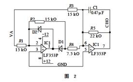 電壓信號VA和電流信號IA經與微電平信號REF比較,取得電壓和電流信號的正半周;經RC濾波后由信號“或”電路,形成含有功率因數角的信號;由單片機去除其中的電壓半周期,即得功率因數角。