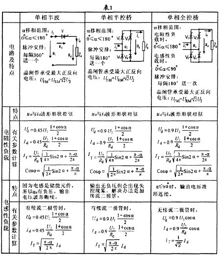 從表1中可見,對于單相整流電路當晶閘管的控制角α>0°時,ud的波形就不連續,只有單相全控橋電感性負載,α>90°時,ud的波形不連續。同樣從表2可見,對于三相整流電路,三相半波電路是以α=30°。作為輸出電壓波形連續與否的分界點;而三相橋式整流電路(包括半控橋和全控橋)均是以α=60°作為輸出電壓波形連續與否的分界點。