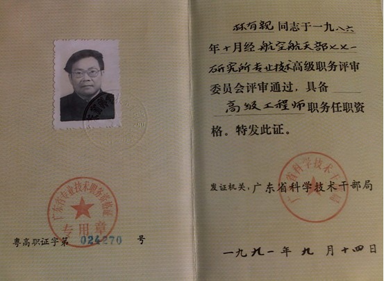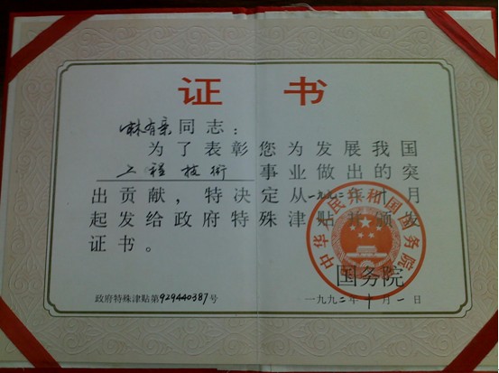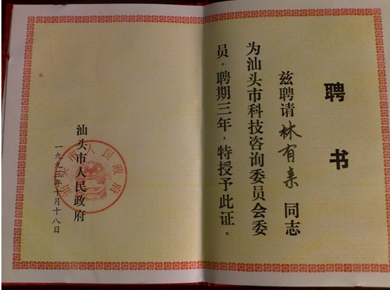 林有親先生的榮譽證書