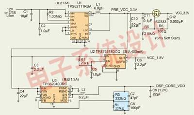 我們構(gòu)建了若干個電源管理參考設(shè)計,并進行數(shù)字音頻/視頻應(yīng)用的測試。這些設(shè)計均采用TI的TMS320DM6?43和TMS320DM6?46處理器,這些處理器能滿足排序、電壓精度和啟動要求。圖1是12V電源的參考設(shè)計電路圖。該設(shè)計采用TPS62111同步降壓轉(zhuǎn)換器、TPS62040同步降壓轉(zhuǎn)換器以及TPS73618低壓降調(diào)節(jié)器,它們分別提供3.3V、1.2V和1.8V電壓軌。這種參考設(shè)計包含一個簡單的外部MOSFET、電阻和電容延遲電路,以使3.3V電壓軌能滿足自升壓模式排序方案要求。TPS62040不但提供1.2V的內(nèi)核電壓,而且還可滿足引腳5軟啟動電容的排序要求。這種解決方案的容差為±3%,效率在90%以上。為滿足主機升壓模式排序方案要求,可以將一個類似的MOSFET、電阻以及電容電路增加到1.2V電壓軌。