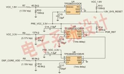 圖2是復(fù)位電路。該電路采用TPS3808和TPS3803電源電壓監(jiān)控器來監(jiān)控電壓軌的變化情況。請采用最小值的TPS3808G01(U5)來設(shè)計復(fù)位電路電源。如果需要大于3.3V電壓軌/1.5A電流和1.2V電壓軌/1.2A電流,那么TPS54350和TPS54110SWIFTDC/DC轉(zhuǎn)換器可能會被分別用于實現(xiàn)3A和1.5A電流。SWIFT穩(wěn)壓器具有基于DaVinci技術(shù)的數(shù)字視頻EVM的特點。如欲了解更多采用了線性調(diào)節(jié)器、TPS40KDC/DC轉(zhuǎn)換器、TPS62xxxDC/DC轉(zhuǎn)換器或多輸出電源管理單元(PMU)的5V和12V輸入電源