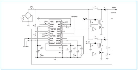 圖 3 顯示了業界首款單芯雙相交錯式 PFC 預調節器——TI UCC28070 的簡化原理圖。交錯雙相相互之間的相位差為 180°,這樣則消除了波紋電流,從而可以使用更小的電磁干擾 (EMI) 濾波器以及外觀更小巧的 PFC 輸出電容器。雙相交錯式拓撲結構、體積更小的元件是嵌入式馬達驅動電路的理想解決方案。交錯式 PFC 可滿足非常高的功率密度要求。
