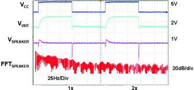 圖2耳機(jī)驅(qū)動(dòng)器上電和斷電時(shí)耳機(jī)上測(cè)到的電壓波形和頻譜