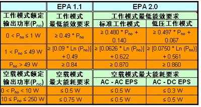 表1:美國環保署“能源之星”外部電源的1.1及2.0版規范。