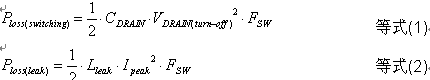 要滿足上述規范對外部電源工作能效及待機能耗的要求,我們首先需要分析清楚損耗的來源。事實上,就工作時的損耗來說,主要包括兩個方面,分別是開關損耗和由泄漏電感導致的損耗,這兩類損耗分別可以用等式(1)和等式(2)來量化: