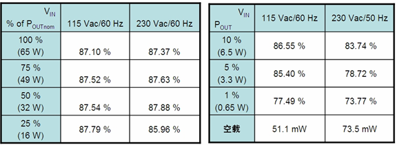 典型65 W筆記本適配器演示板能效測試結果
