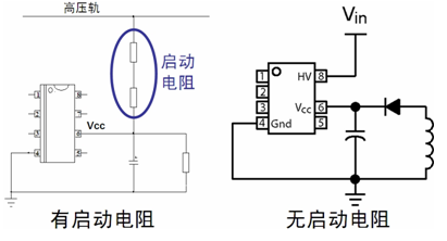 圖1:帶啟動電阻與不帶啟動電阻(內置電壓啟動電流源)對比。