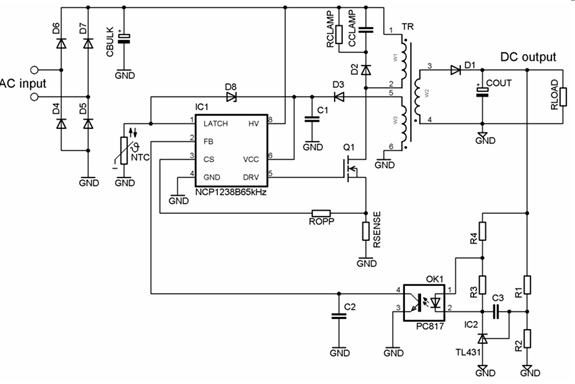 這系列控制器還采用輕載時頻率反走技術和跳周期模式,降低輕載時的開關頻率,從而提升能效;同時,開關頻率在25 kHz時鉗位,從而消除可聽噪聲。此外,這系列器件提供多種保護特性,如雙啟動電流電平、輸入欠壓及主電源過壓保護、過載保護、雙過渡保護閾值、軟啟動和閂鎖保護等。這系列器件還提供可選的動態自供電(DSS)功能,從而無需輔助繞組; 并內置斜坡補償,不需要外部設定。以NCP1238為例,這器件的典型應用電路圖如圖2所示。