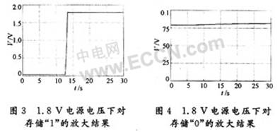 圖4為靈敏放大器在1.8V電源電壓在室溫條件下對存儲信息“0”放大的仿真圖形。從仿真結果可以看出,輸出電壓有微小的變化,但是在整個過程中輸出電壓都低于0.1V,都在低電平范圍內。這說明該電流靈敏放大器在室溫情況下能對存儲信息“0”進行可靠讀取。