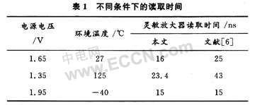表1是該電流靈敏放大器在不同電源電壓和環境溫度下的讀取時間。從表1中可以看出在較低電源電壓和惡劣環境下該電流靈敏放大器仍然有比較好的性能。表1還把本文的電流靈敏放大器的仿真結果與參考文獻[6]所仿真的結果進行了對比,可以看出在本文所設計的電流靈敏放大器在某些情況下有更快的讀取速度。