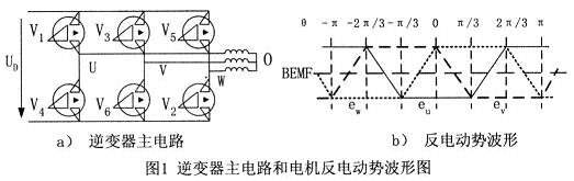 實現(xiàn)無刷直流電機電子換相及PWM控制的逆變器主電路如圖1a所示。采用兩兩通電方式,即每一個瞬間有兩個功率管導通,每隔60°電角度換相1次,每一功率管導通120°電角度。功率管的導通順序是:V6V1→V1V2→V2V3→V3V4→V4V5→V5V6。